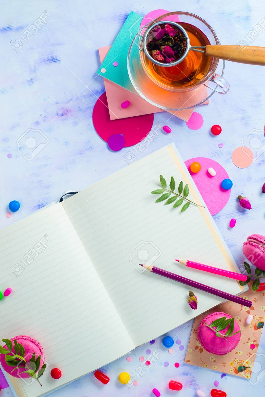 Immagini Stock - Piatto Femminile Disteso Con Tè, Dolci E Libro Aperto Con Pagine Vuote. Sfondo Colorato Festa Con Coriandoli. Concetto Di Pianificazione Con Spazio Di Copia. Image 97639320.
