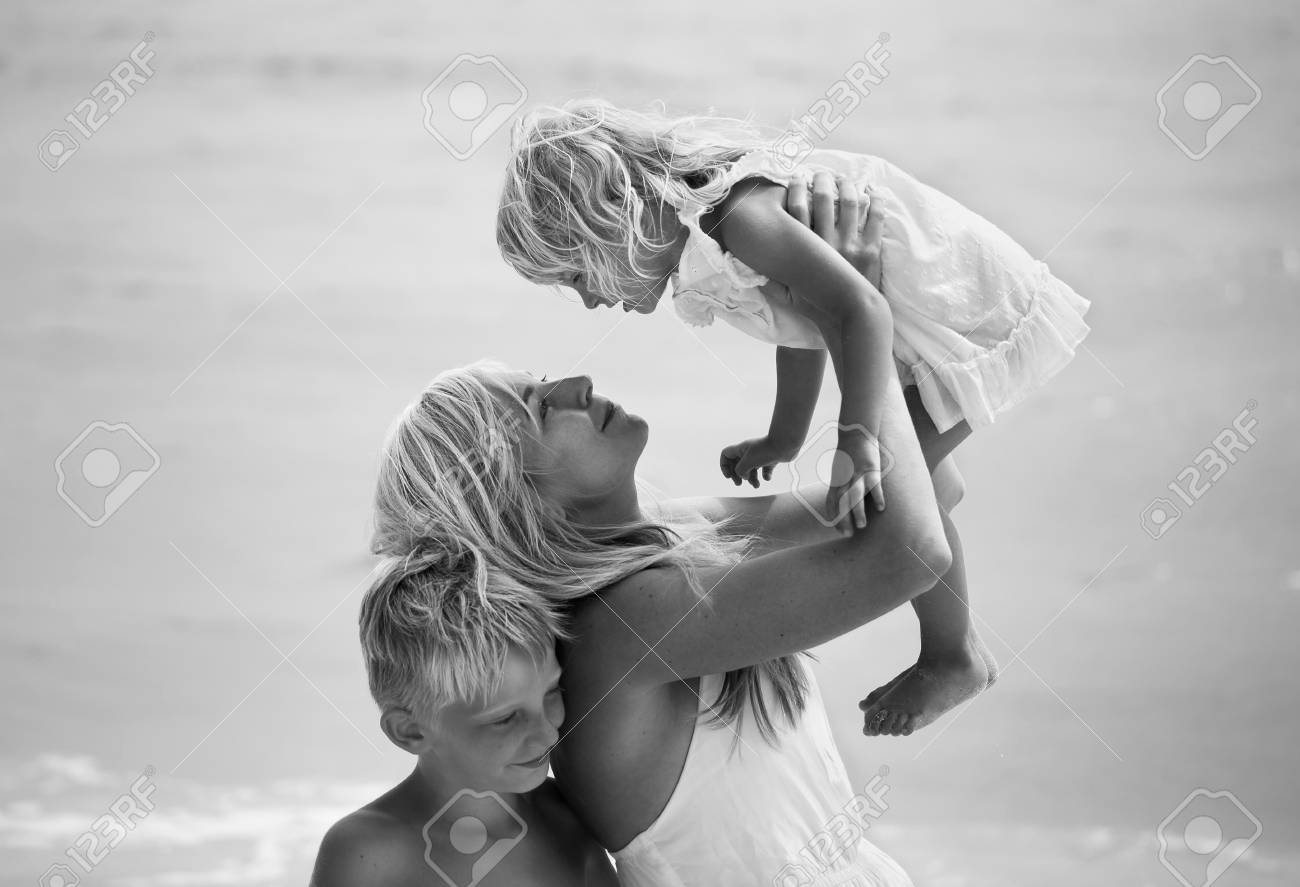 Conceito De Maternidade, Família Feliz Perto Do Mar, Mãe, Filho E Filha, Sorrindo, Aproveite Férias, Preto E Branco Fotos, Retratos, Imágenes Y Fotografía De Archivo Libres De Derecho. Image 66450312.