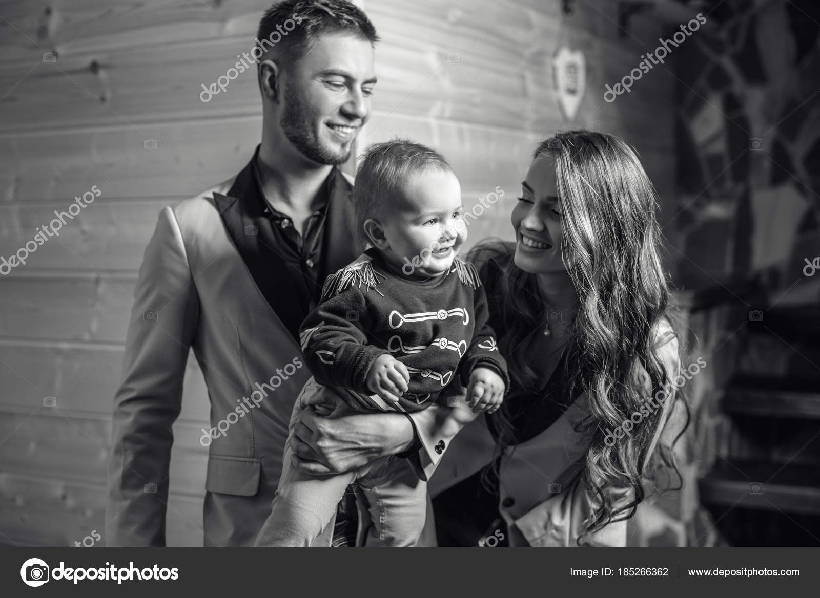 Jovem família feliz junto no interior da casa. Foto preto e branco. — Stock Photo © innervision #185266362